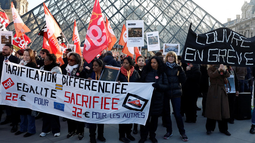 Kötü çalışma koşulları ve güvenlik sorunları nedeniyle greve giden müze çalışanları, Louvre’un önünde toplanarak “Louvre Müzesi grevde” yazılı pankart açtı. Genel Emek Federasyonu (CGT) Fransız Demokratik Emek Federasyonu (CFDT) ve SUD sendikası 8 Aralık’ta müze çalışanlarının greve gideceklerini duyurmuştu.